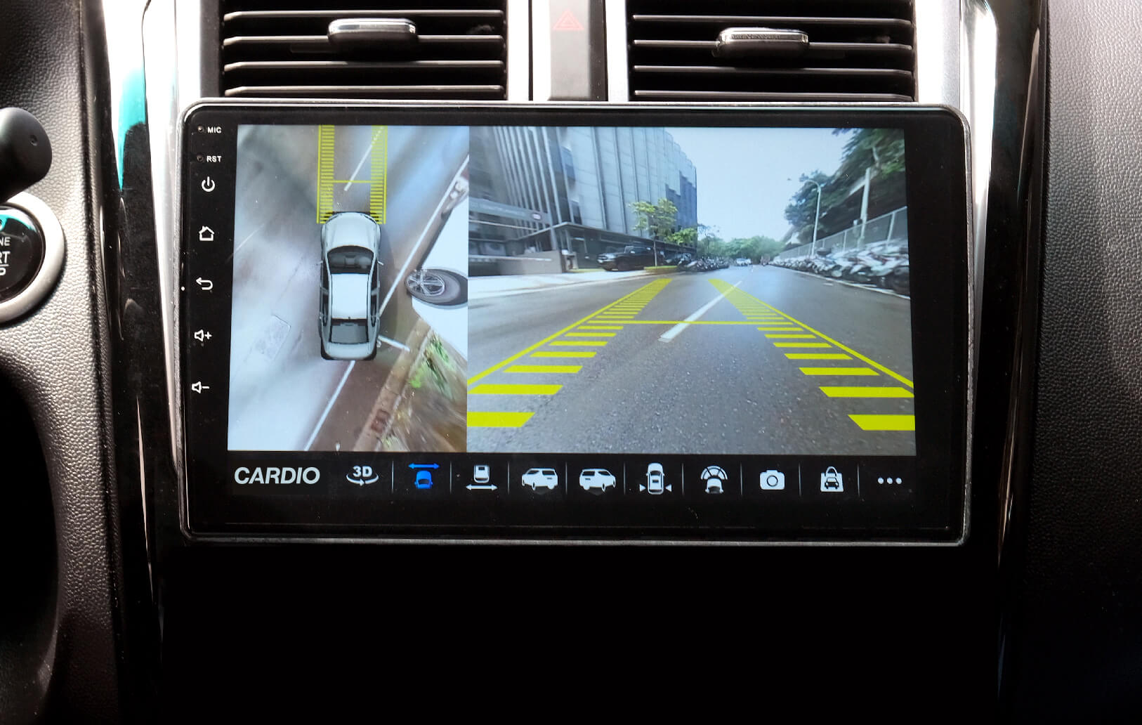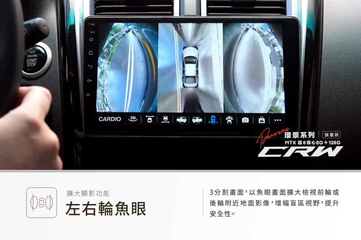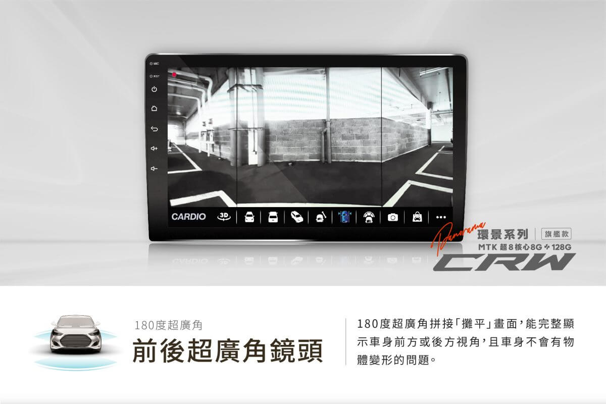 CARDIO CRW車用安卓機最強大的180度超廣角拼接「攤平」畫面,能完整顯示車身前方或後方視角,且不會有一般全景功能車身周圍物體變形的問題,讓你不只知道車旁「有東西」,更能確實知道到底是「什麼東西」,並有效掌控車身前後的狀況及距離感。
