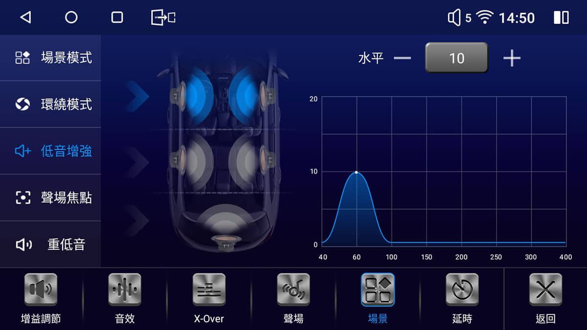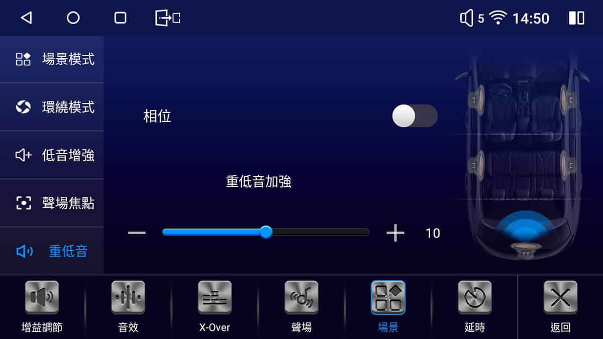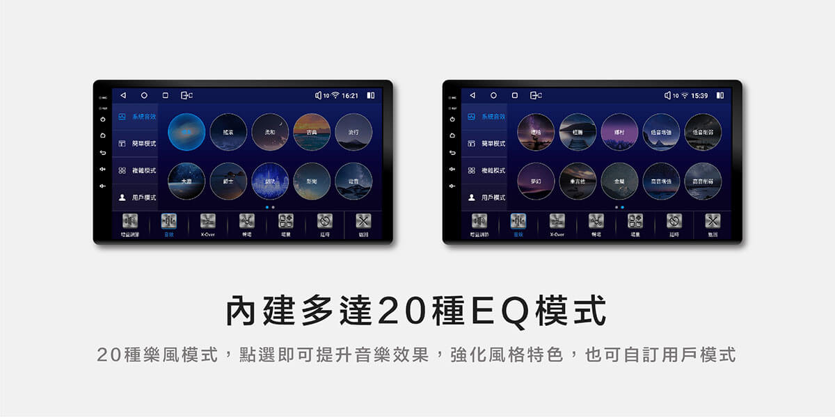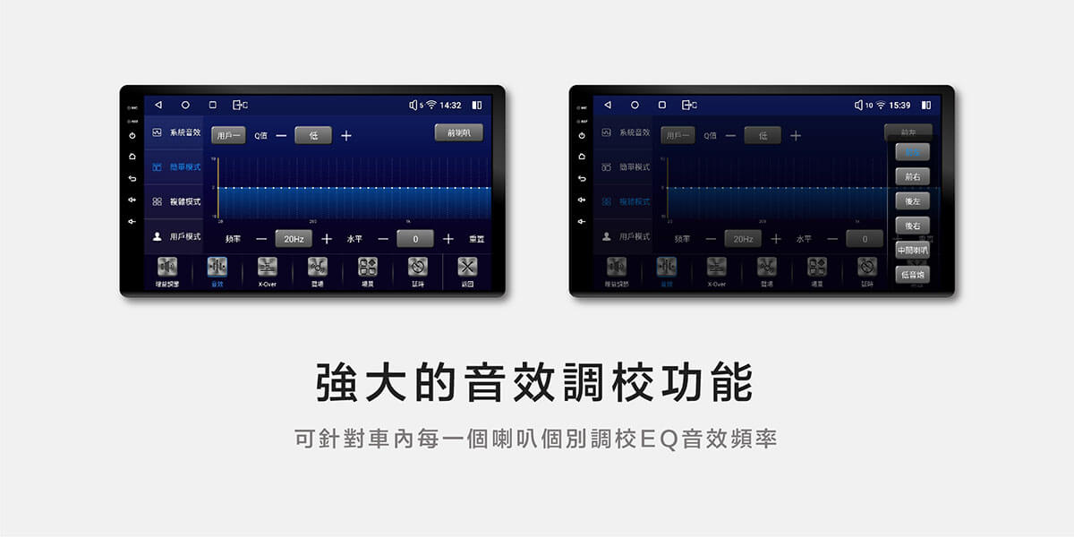 EQ音效模式可說是車用安卓機最基本的配備,甚至沒有DSP音效晶片的機種,都可以用軟體模擬的方式達成,但差別就在於提供的種類多寡,以及可以微調的細節。CARDIO CPW Pro環景聲效款不僅內建20種的EQ音效模式,讓你不管聽什麼音樂都有最適配的選擇,還可以開啟自定用戶模式,針對車內的每一個喇叭個別調校,可以調整到與你感官最合拍的音效。