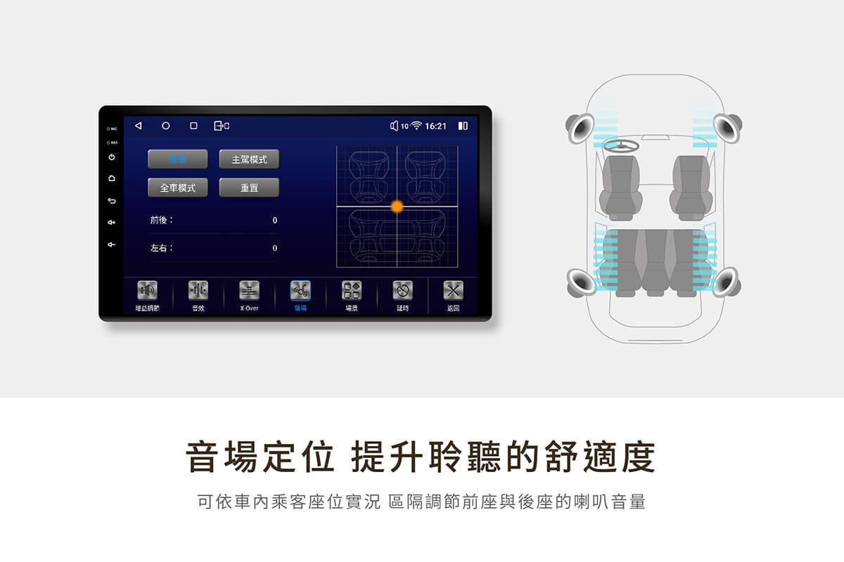 依照車內空間大小和乘坐人數的不同,會有不同的聆聽需求,比方說單獨駕駛、僅前座有人到全車滿載,就可以依照前、後座的喇叭音量,將音場定位調整到最適合的位置,提升聆聽的舒適感。如果是休旅車或是大型房車等空間較大的車款,這樣的定位調整會更有感覺。