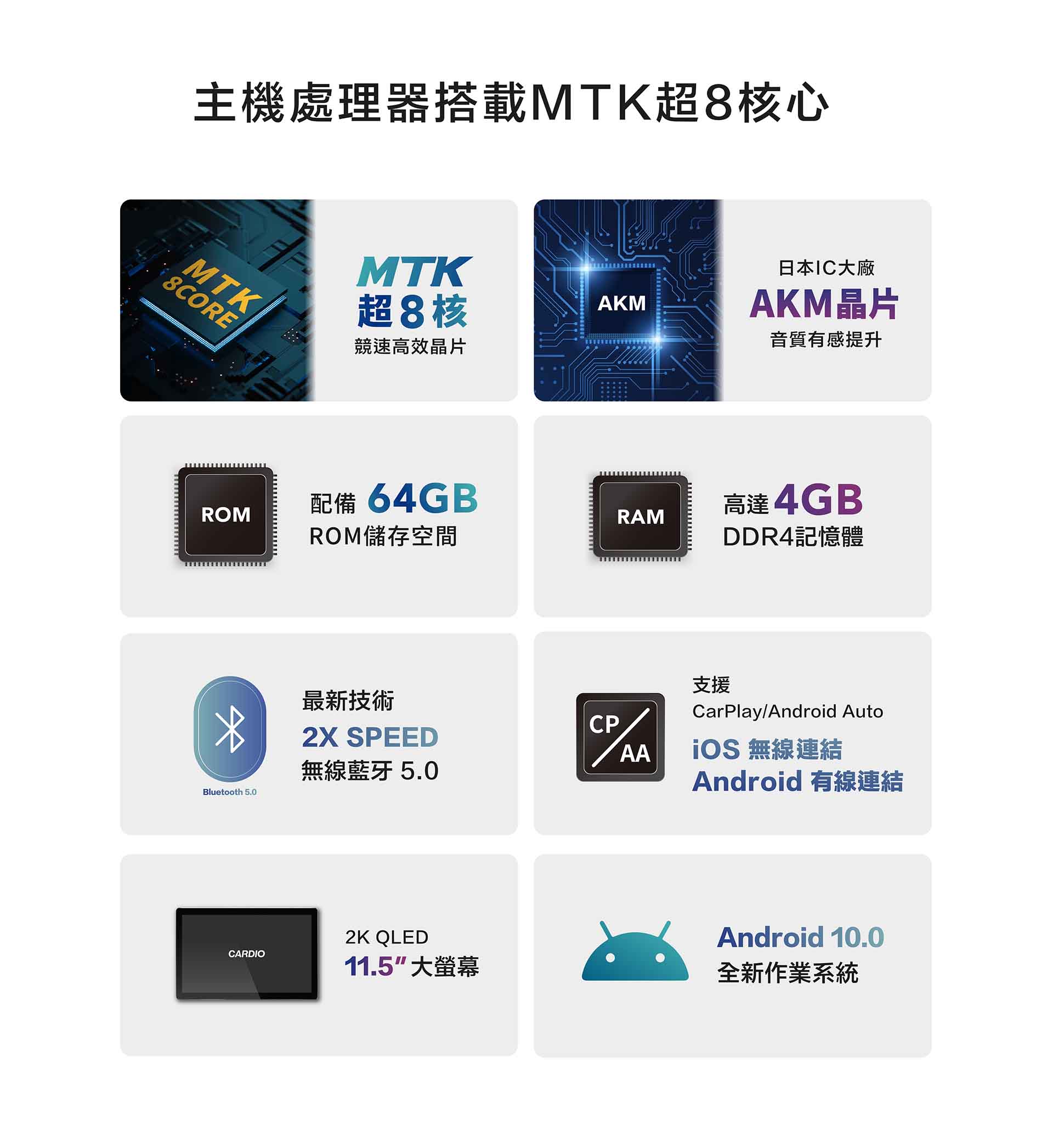 - ANDROID 10.0,車規MTK超八核,DDR4 4G,ROM 64G