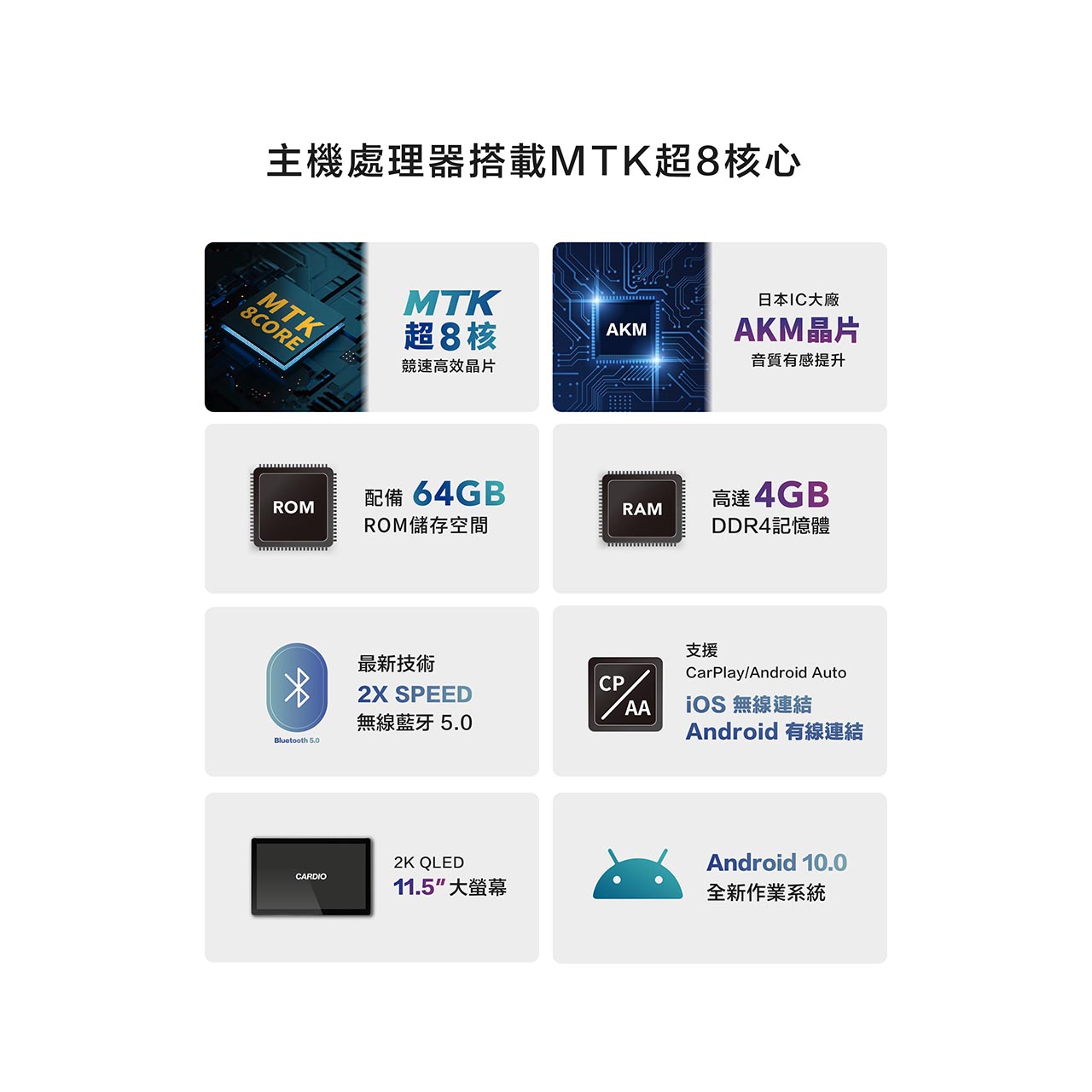 - ANDROID 10.0,車規MTK超八核,DDR4 4G,ROM 64G