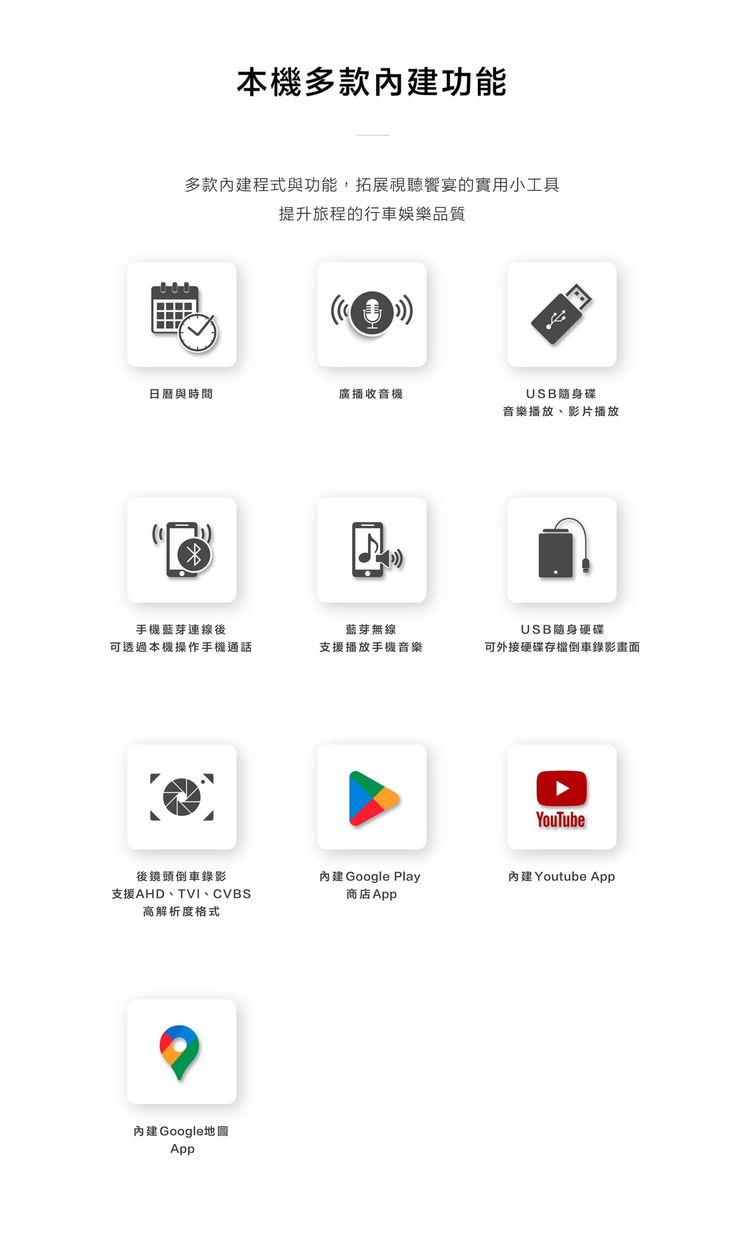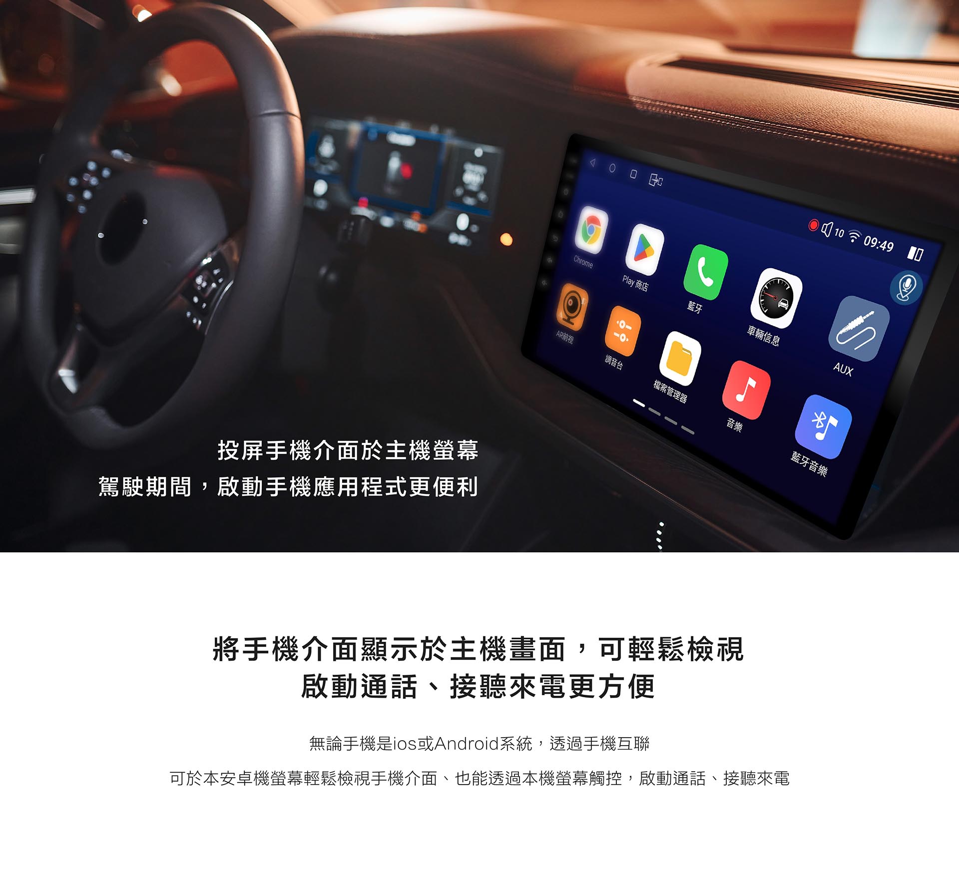 高規格車用安卓影音系統 / 高速流暢穩定的使用者體驗 / 無損安裝模式 / 相容於大部分車型 |